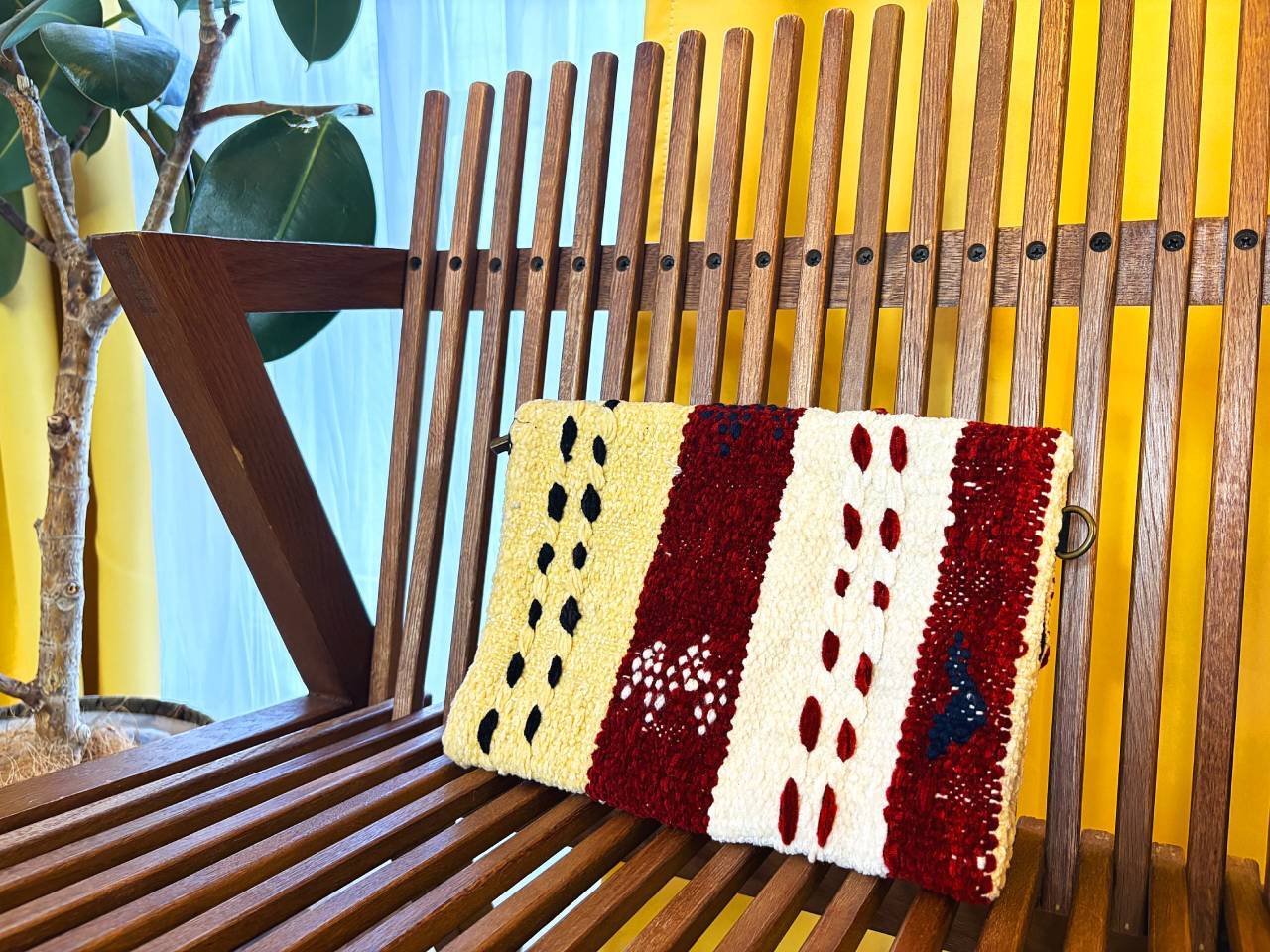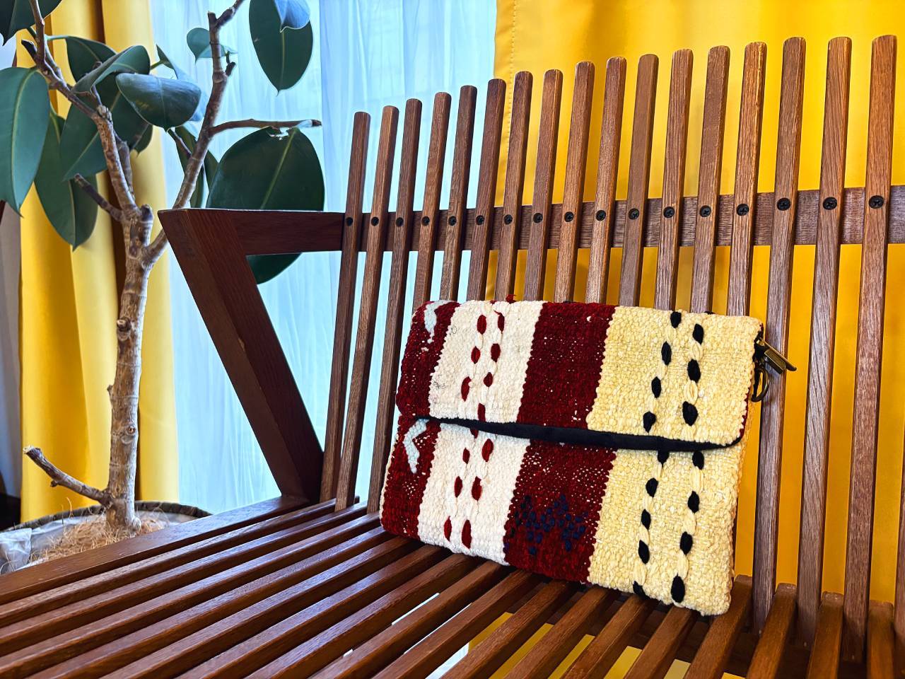 モロッコのヴィンテージラグや手織り布を再利用して作られた、世界に一つのクラッチバッグ。伝統の色柄がコーディネートのアクセントになります。