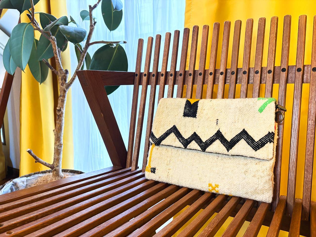モロッコのヴィンテージラグや手織り布を再利用して作られた、世界に一つのクラッチバッグ。伝統の色柄がコーディネートのアクセントになります。