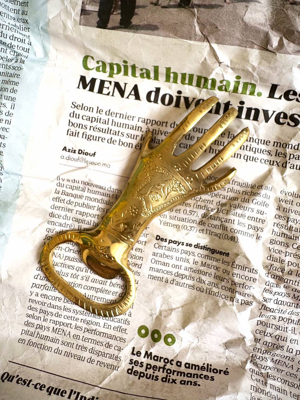 モロッコのお守り「ハムサ(ファティマの手)」を模した真鍮製の栓抜き。手彫りの装飾が美しい、実用性と装飾性を兼ね備えたアイテムです。