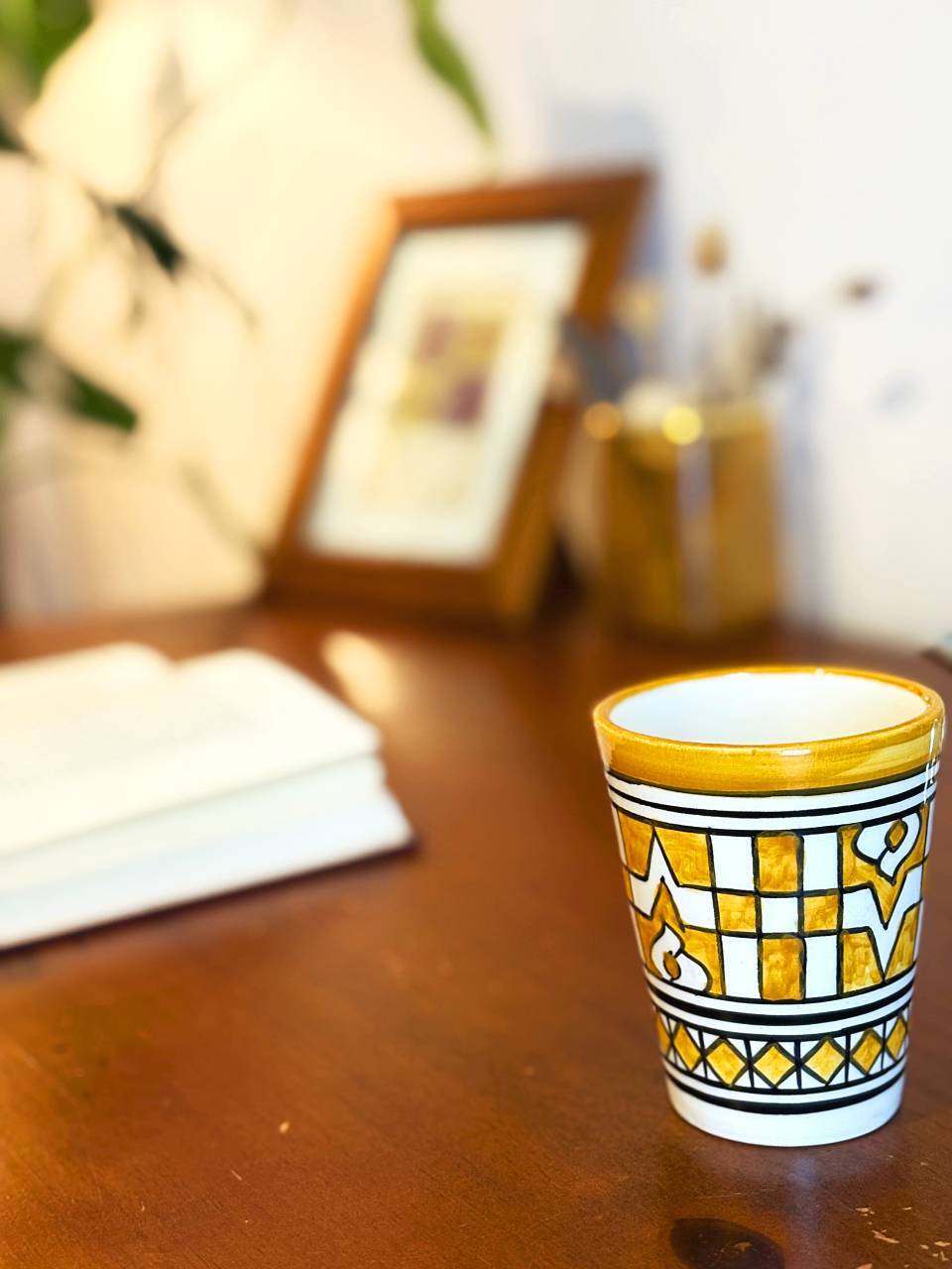 伝統文様が施されたモロッコ陶器のコップは、見ているだけで気分が上がるデザイン。ティータイムがもっと楽しく、日常のテーブルに異国の風を運んでくれます。